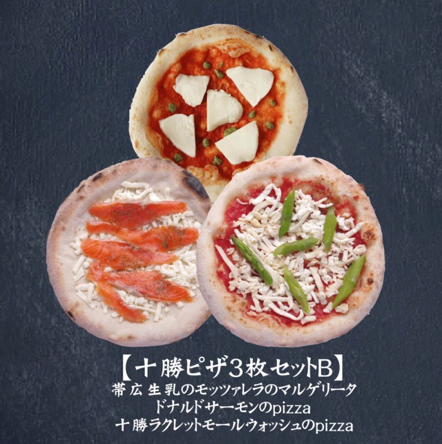 【十勝ピザ3枚セットB】 ・帯広生乳モッツァレラのマルゲリータx1枚 ・ドナルドサーモンのpizzax1枚 ・十勝ラクレットモールウォッシュのpizzax1枚 新鮮な帯広生乳を使用した、とろけるような食感がクセになるモッツァレラチーズ。このチーズを贅沢に使用した、本格ナポリpizzaの味わいをご自宅で楽しめるのがこの商品セットです。 それぞれの商品を適した温度で焼くことで、より一層のおいしさが引き出されます。お家飲みや、イベント時のパーティー、ギフトにもぴったりなセットです。 冷凍商品/直径約19センチ/賞味期限製造日より6カ月/各商品の原材料やアレルギー表示は個別ページで表示していますので、そちらをご覧下さい。